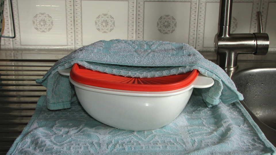 Genau – unter einem fast tropfnassen Handtuch, wie schon auf ähnliche Weise im Artikel “Marmelade im Schlafrock“ beschrieben.